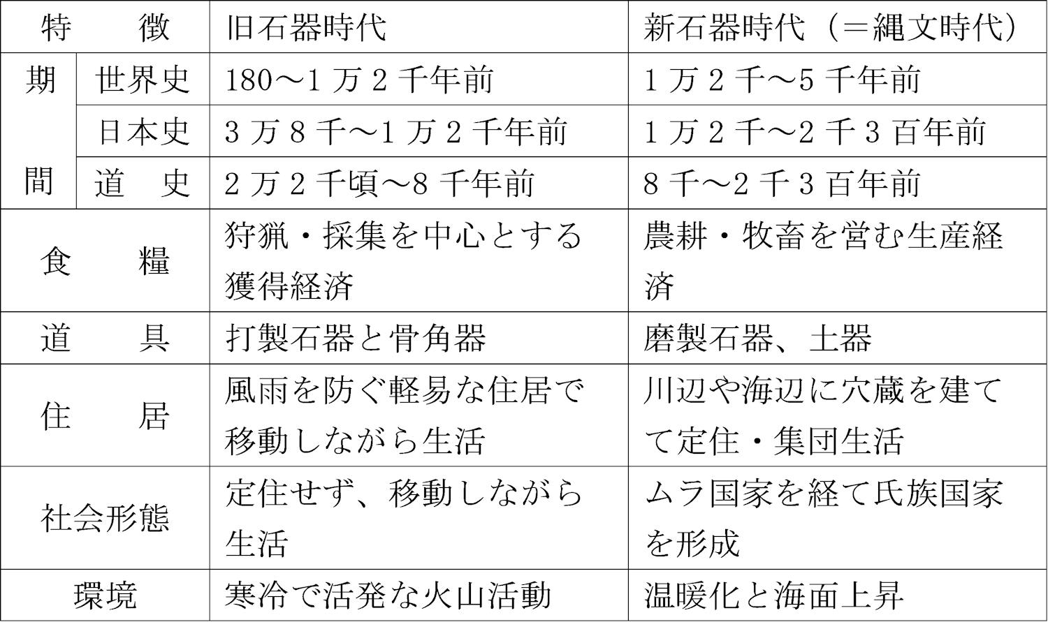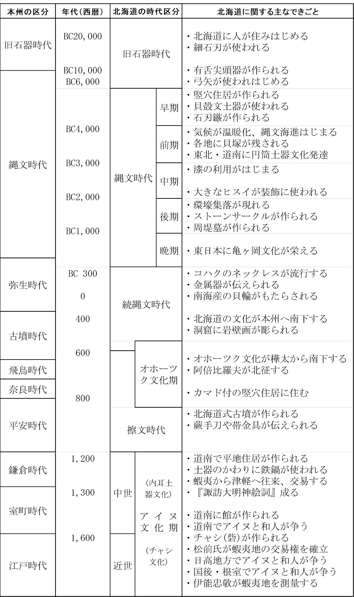 旧石器時代の後期になり、温暖化の進行とともに海水面が著しく上昇し、樺太と大陸間に「間宮海峡(タタール海峡)」、樺太と北海道間に「宗谷海峡」、北海道と本州間に「津軽海峡」、朝鮮半島と九州間に「対馬海峡」が出現し、船による渡航技術が発達するまでの間、生活圏が分断されることによって、独自の発達を遂げることになり、本州以南で進んだ縄文時代は、北海道では約四〇〇〇年も遅れて始まった。(表1)
