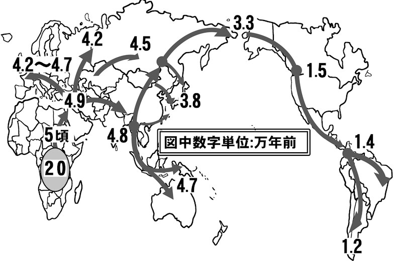 二〇万年前に始まる集団は、五万年前頃までに増えた人口があふれ出し、「図1 ホモ・サピエンスの世界拡散ルート」のように世界中に広がり始めた。