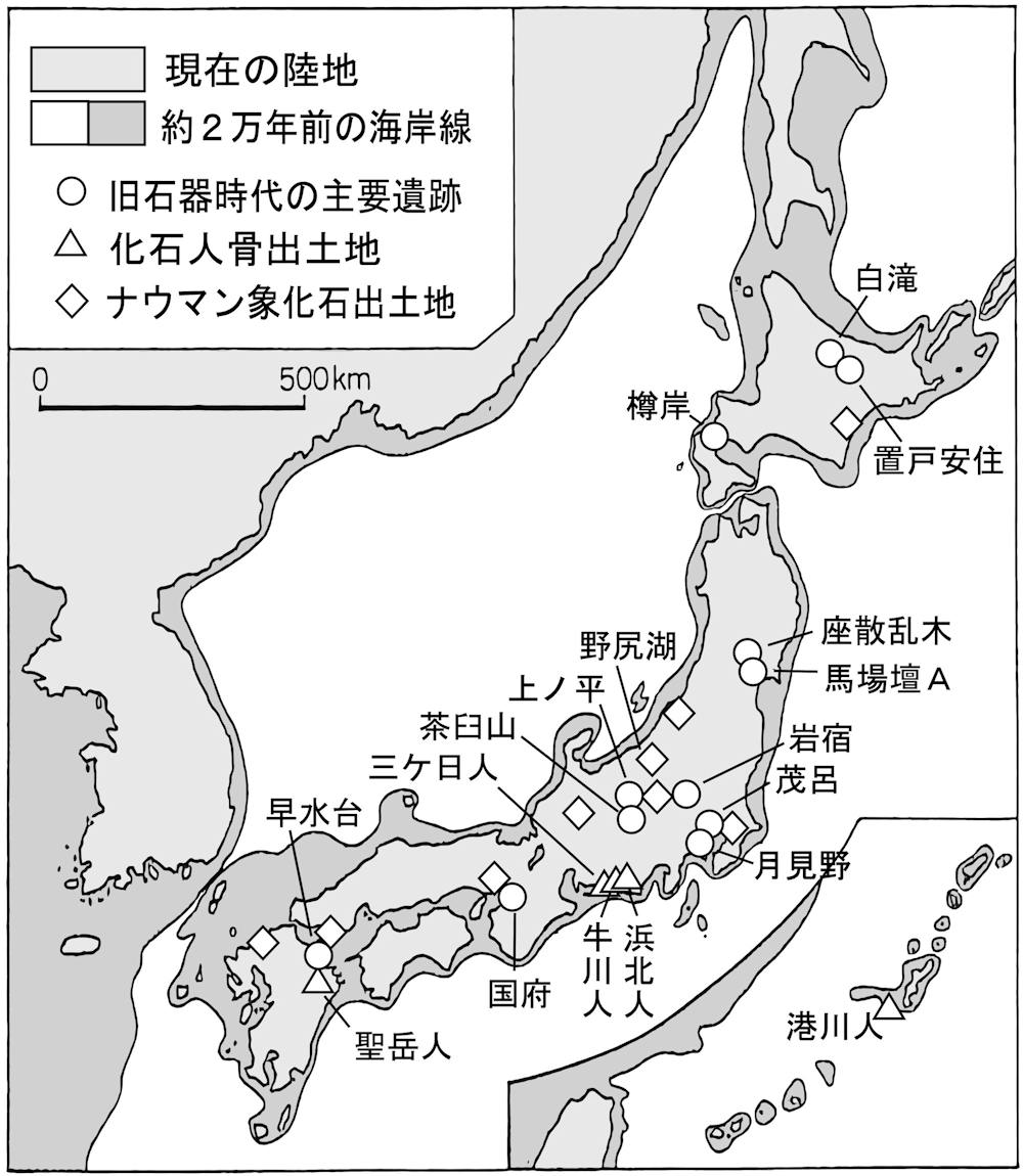 日本の最も古い人類痕跡(石器類)は約三万八〇〇〇年前(長野県香坂山遺跡)で、この人々は中国からモンゴル地域に五万年前頃には到達し、先住の旧人デニソワ人との交雑混血を含めて住み換わった新人ホモ・サピエンスであった。この頃の新人は、まだ中期旧石器時代(八万〜三万五〇〇〇年前)にあって、船による渡海能力を持っていなかった。