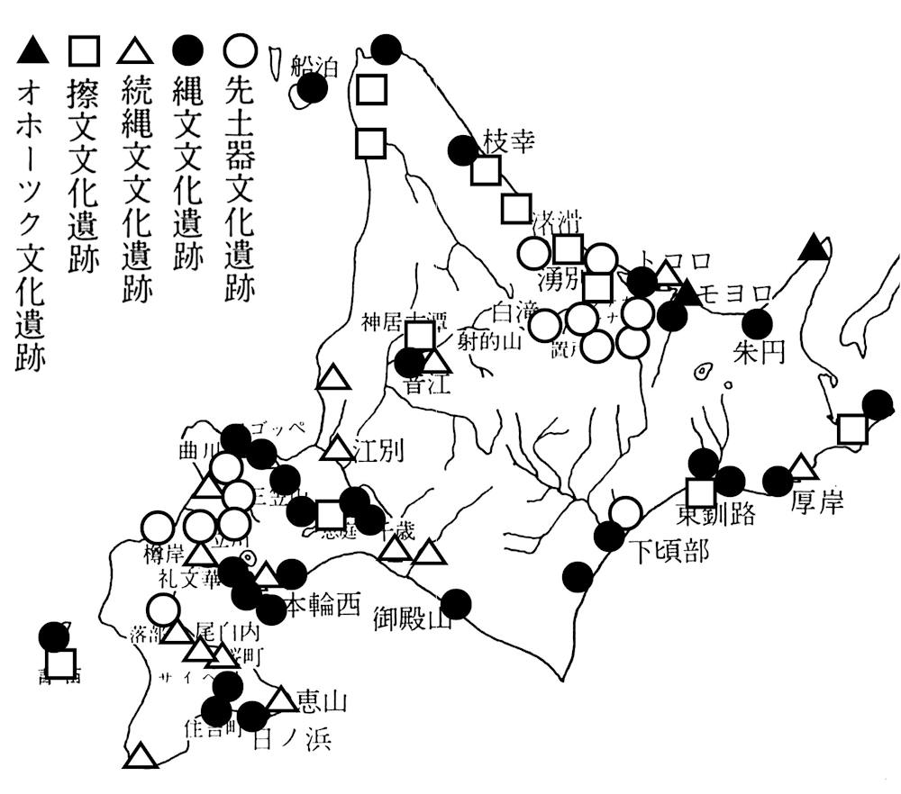 北海道内には、このほかの縄文時代の遺跡に加え、時代の異なる様々な遺跡が存在しており、この分布状況は図7(榎本守恵著「北海道の歴史(昭和五六年発行)」を参考に作図)のとおりである。