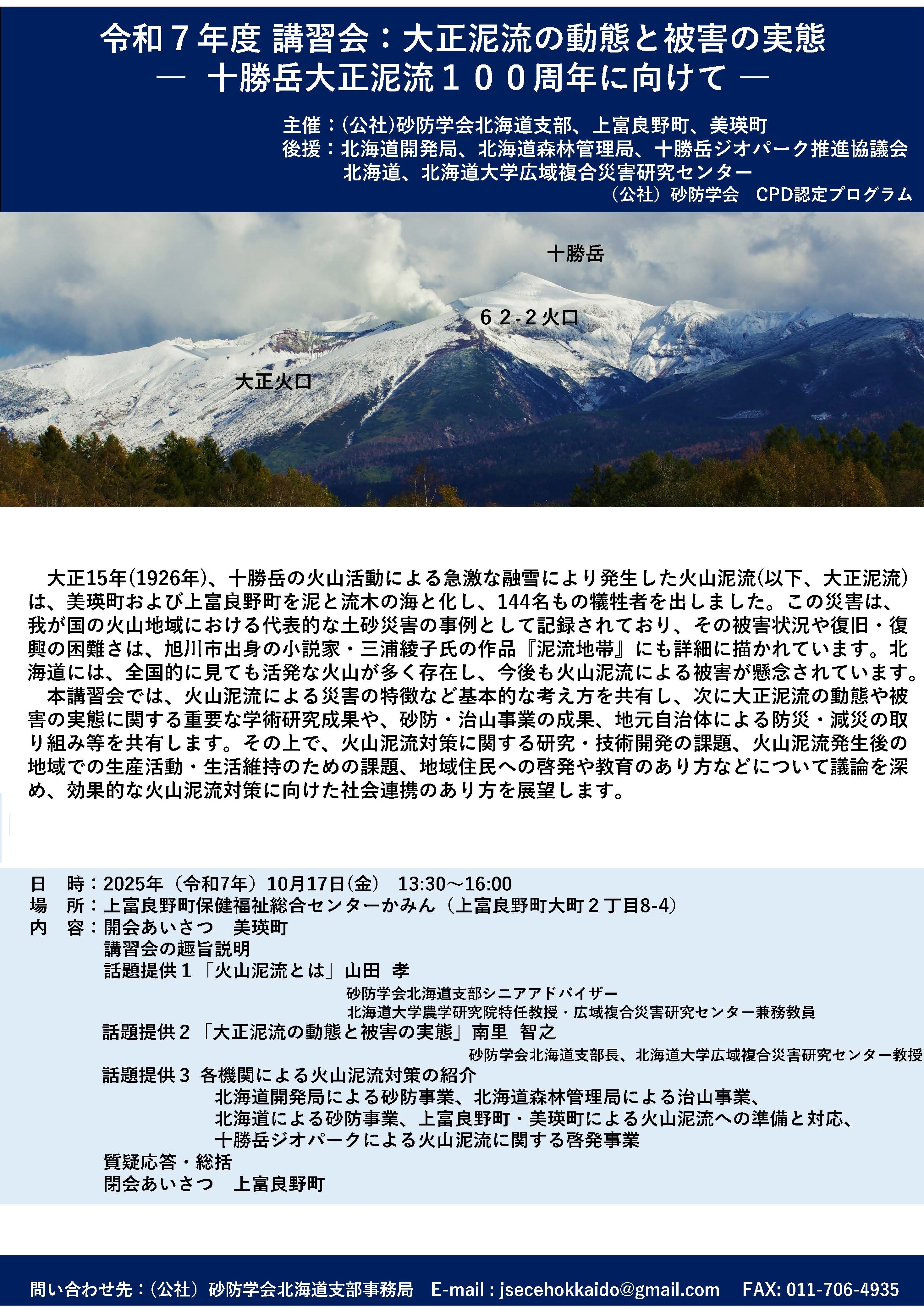 令和8年5月24日で十勝岳大正泥流100周年を迎えることから、火山泥流をテーマとした講習会を開催します。